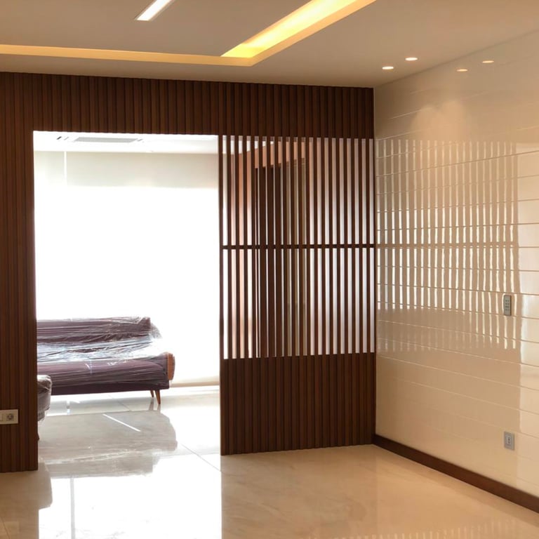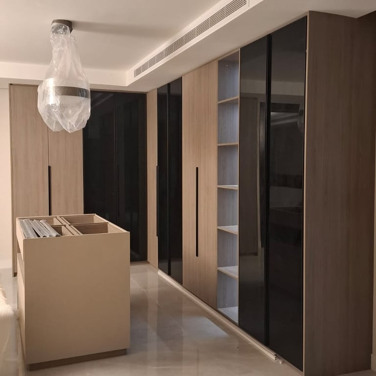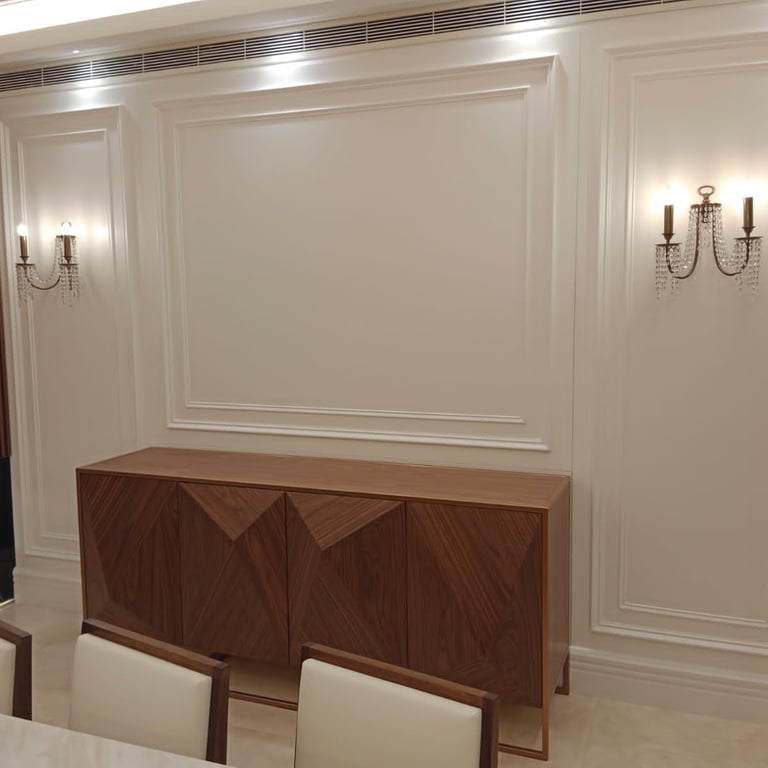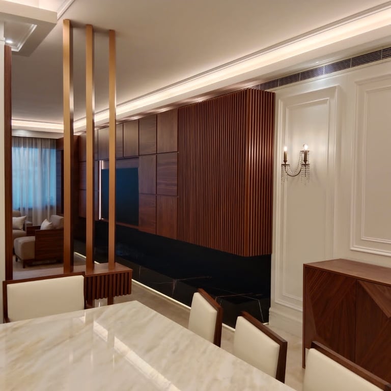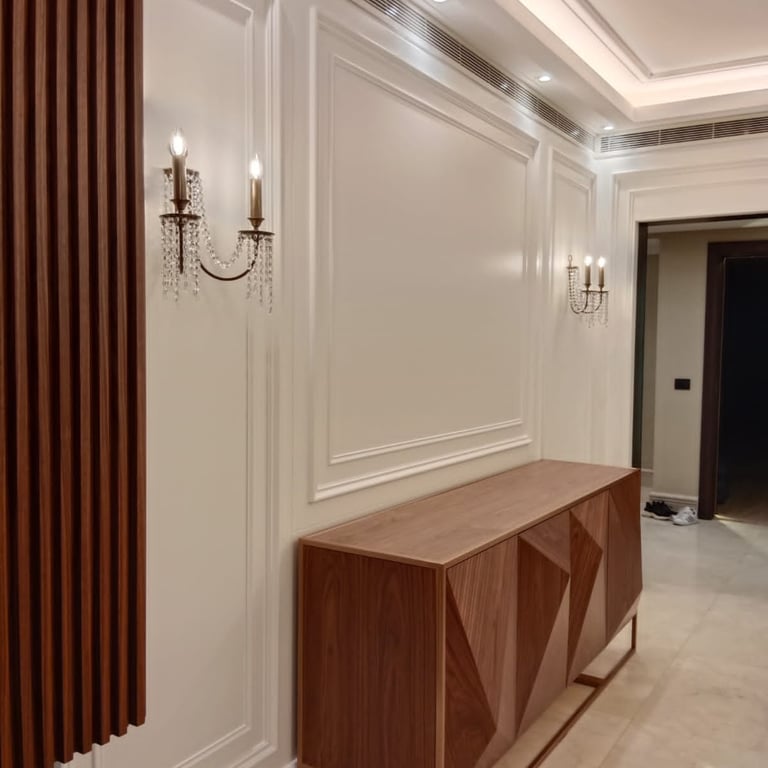 Full apartment interior featuring custom woodwork across living areas, bedrooms, and kitchen