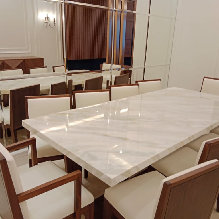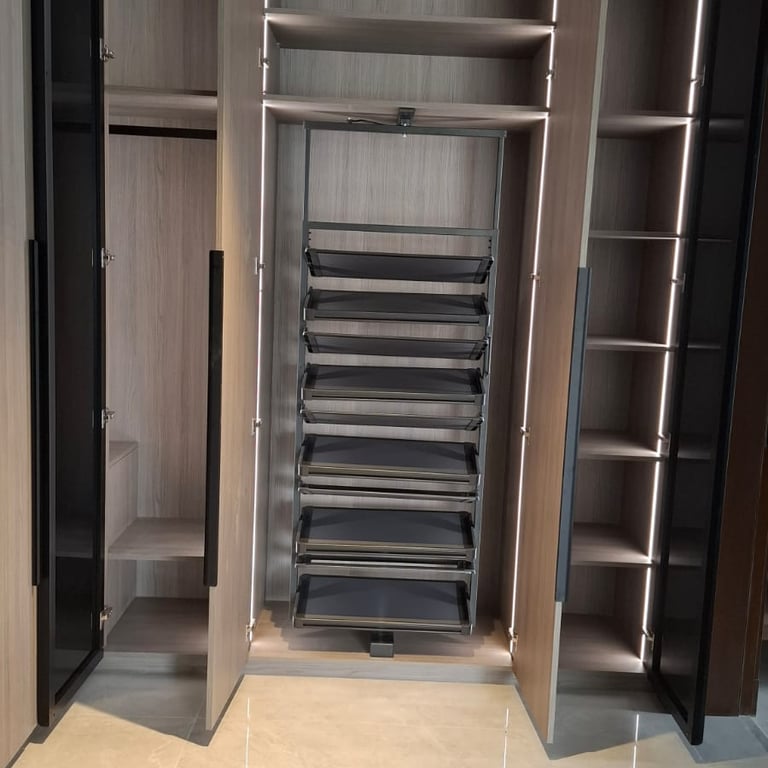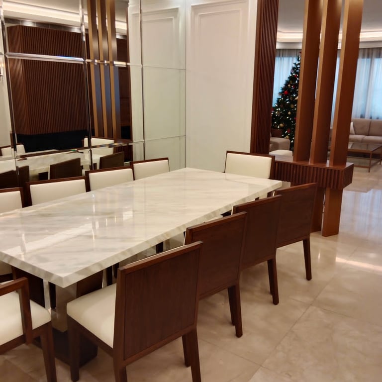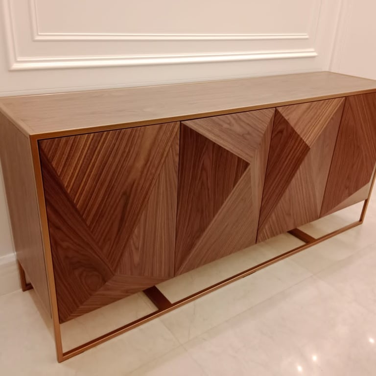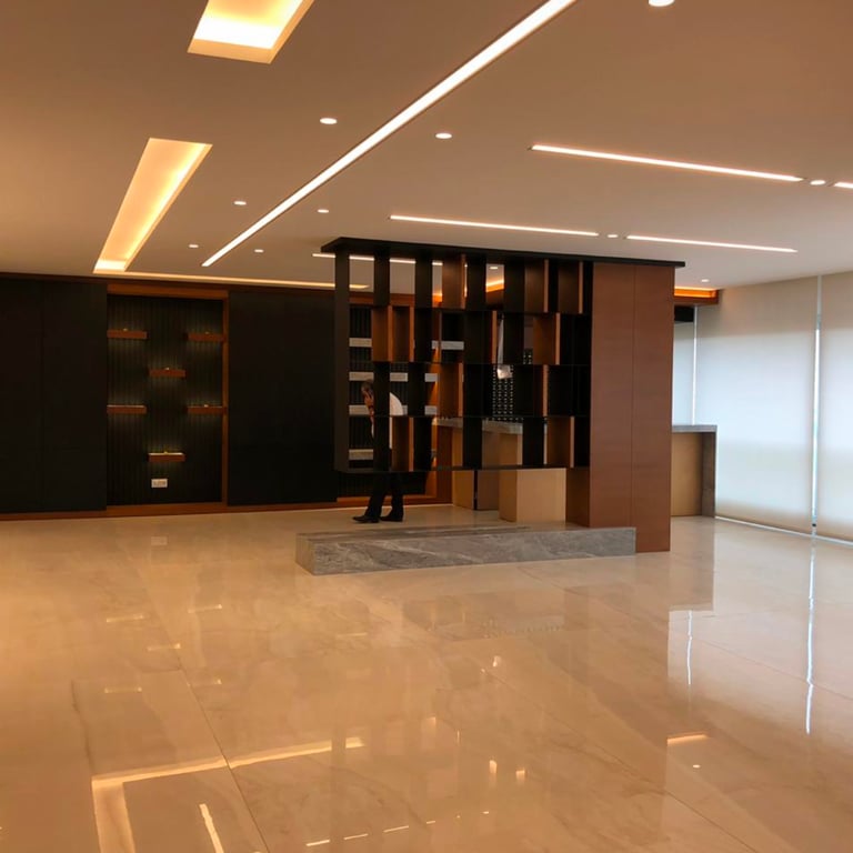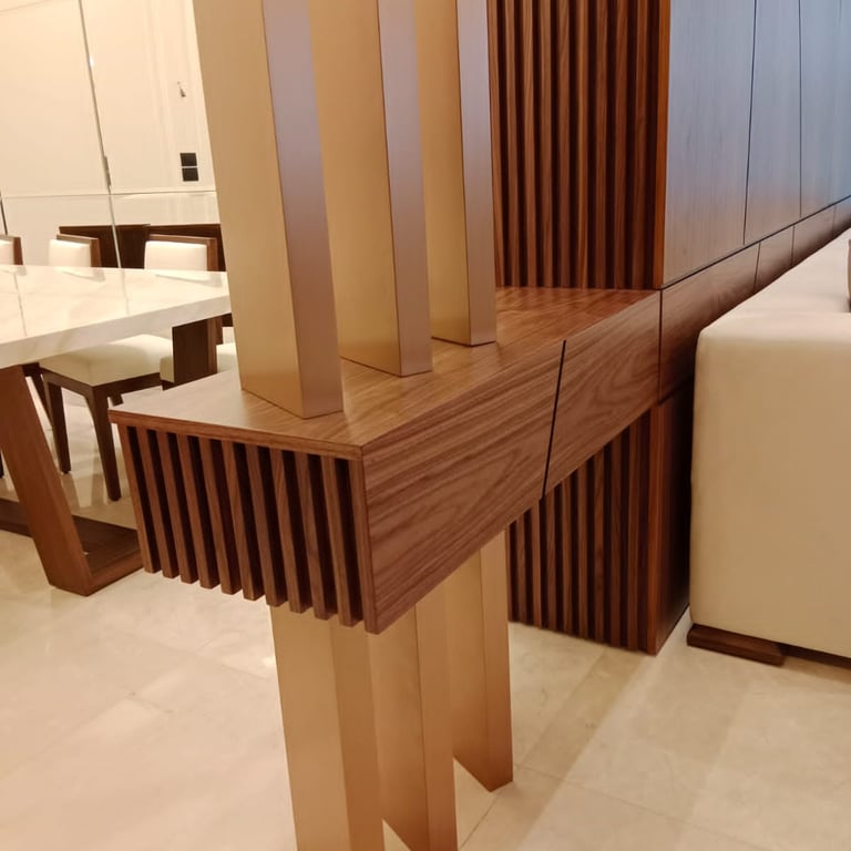 Full apartment interior featuring custom woodwork across living areas, bedrooms, and kitchen