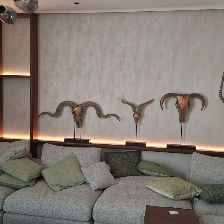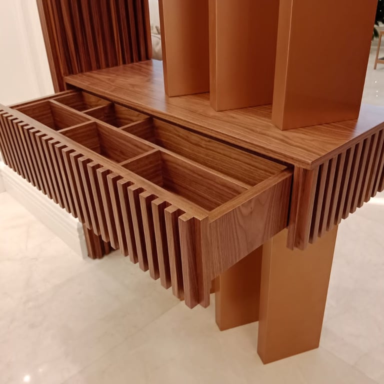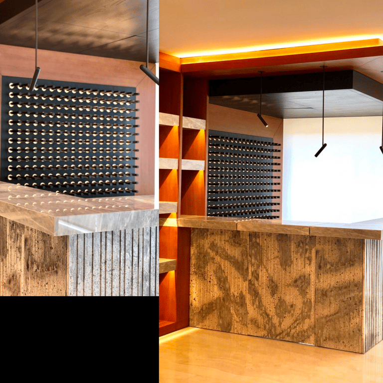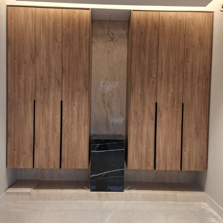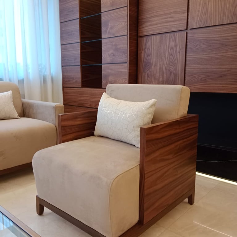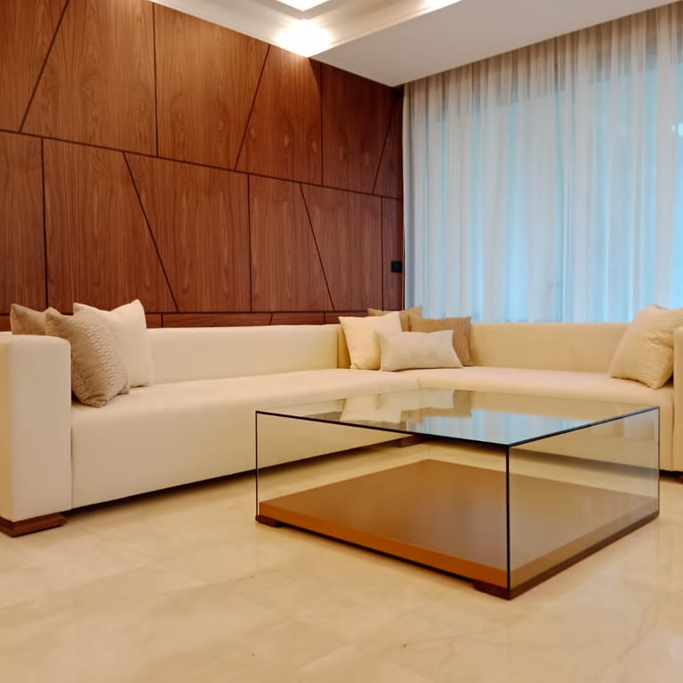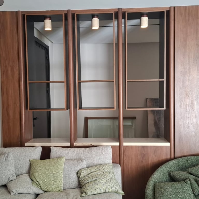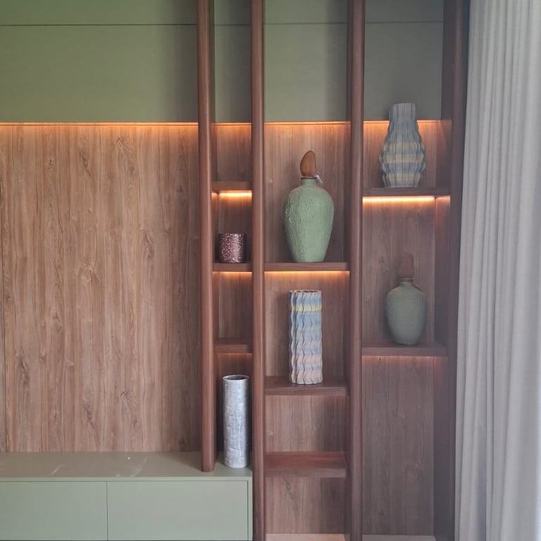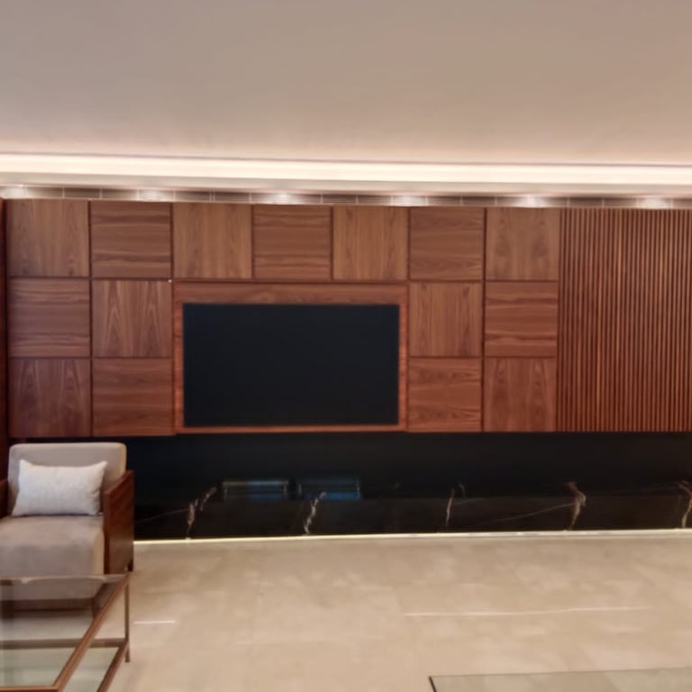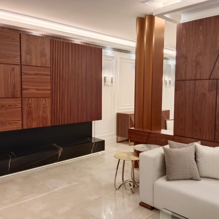 Contemporary living room with custom wooden wall paneling and built-in shelving units.