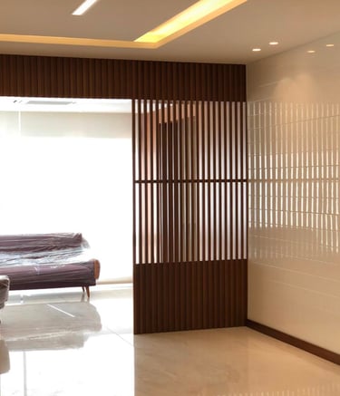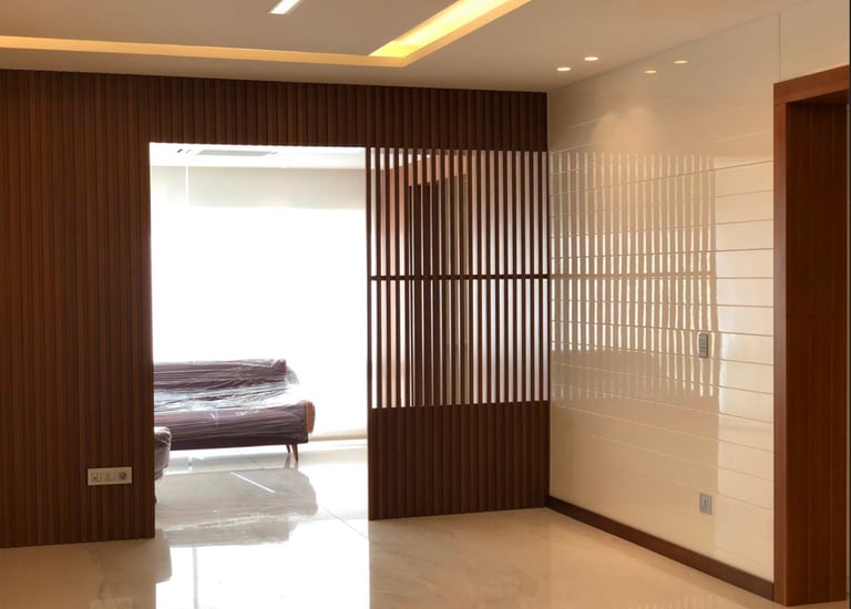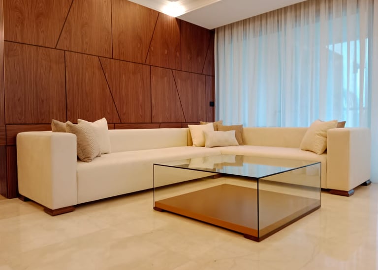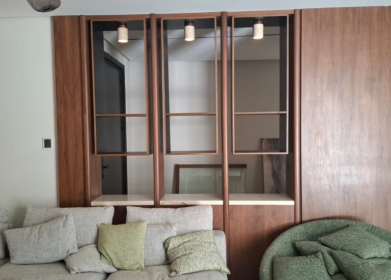 Contemporary living room with custom wooden wall paneling and built-in shelving units