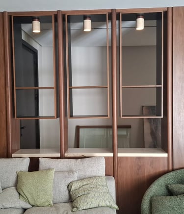 Full apartment interior featuring custom woodwork across living areas, bedrooms, and kitchen